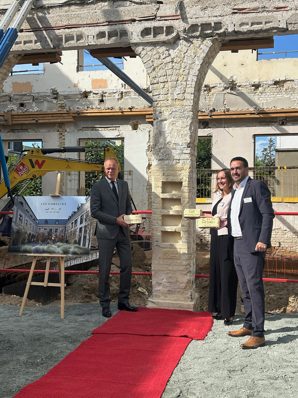 📸 Edouard Philippe, Maire du Havre Président Le Havre Seine Métropole, Guillaume Parisot, Directeur Cap Horn Promotion, et Aurélie Carpentier, Responsable des Filiales et Participations Crédit Agricole Normandie Seine Foncière, ont posé les premières pierres restaurées d’un édifice qui appartient à l’histoire de la Ville du #Havre : Les Gobelins.